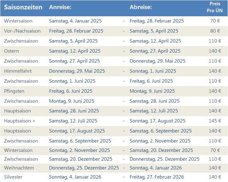 Saisonzeiten mit Preisen für max. 3 Personen